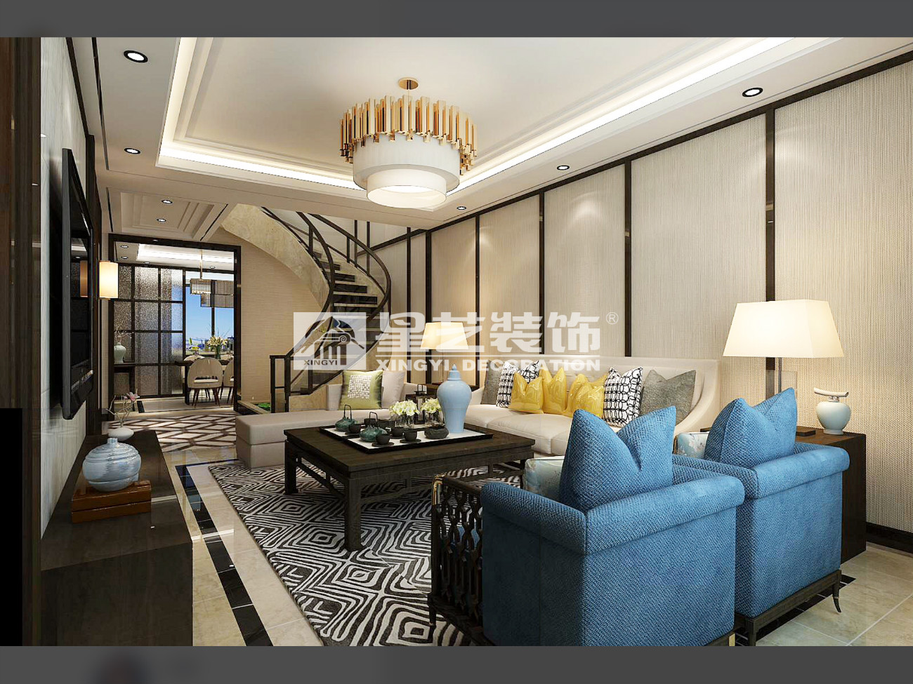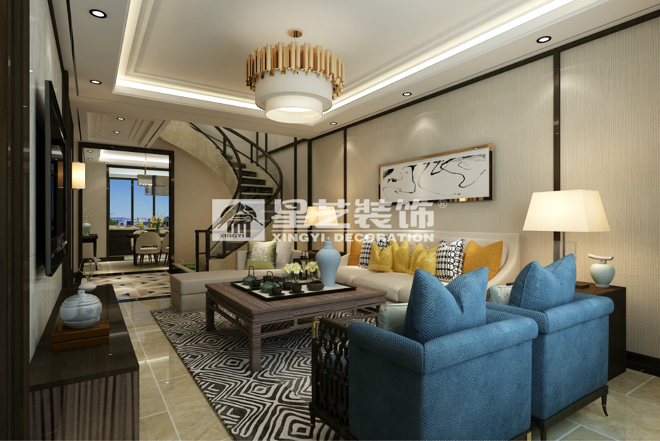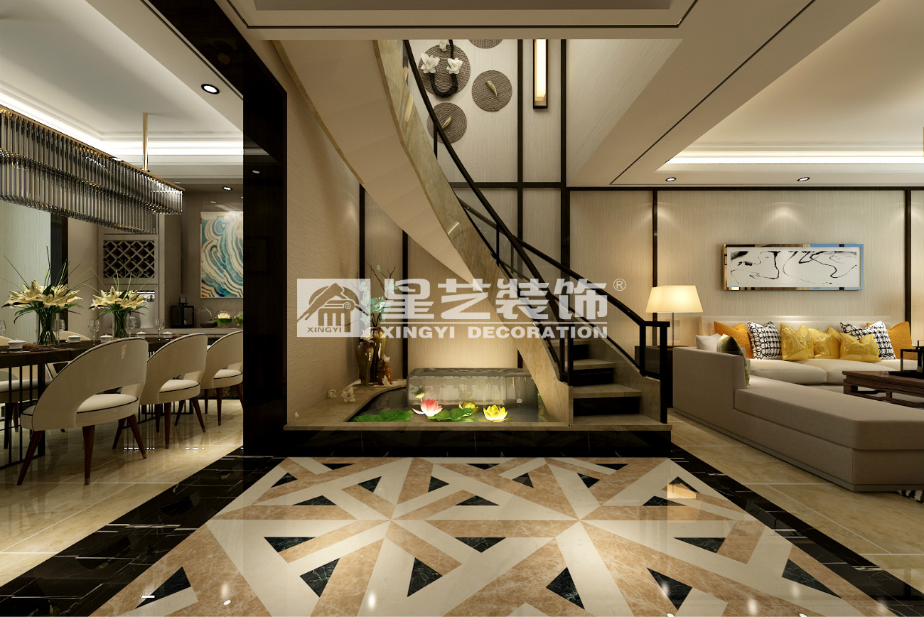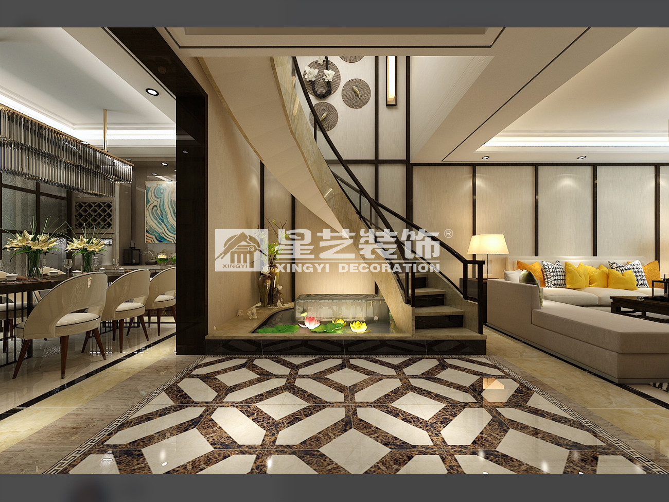 本案為復(fù)式結(jié)構(gòu),樓梯作為承上啟下的重要角色,自然少不了他的亮點(diǎn),弧形玻璃樓梯,于石材自然的交融,展現(xiàn)的時尚大氣,作為入戶主視角,自然少不了現(xiàn)代中式的元素和飾品。