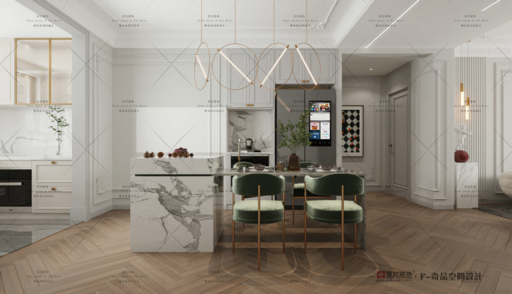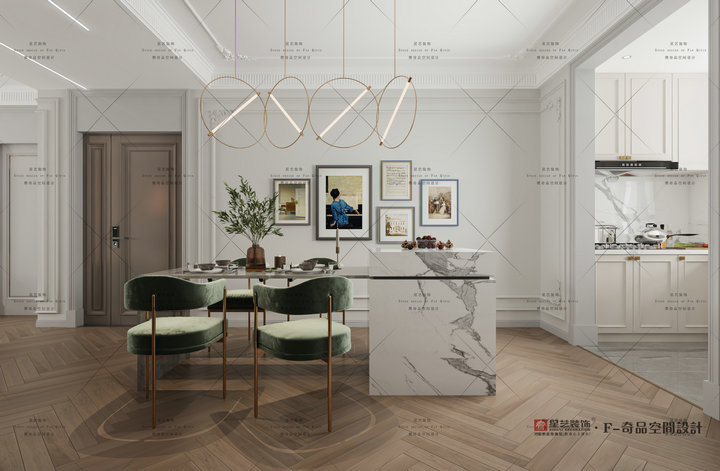 天然紋理的石材島臺,造型上與背景墻線條元素相呼應,更具視覺延伸感,為生活增添了儀式感。陳設的三兩組軟裝使空間靈動而優(yōu)雅,隨性打開的書本恰好點亮了室內(nèi)的文藝氛圍。仿佛還原了與家人聊天、品茶、閱讀的生活情境,在空間藝術(shù)韻律的熏陶下,演繹極具個性的法式輕奢風情。