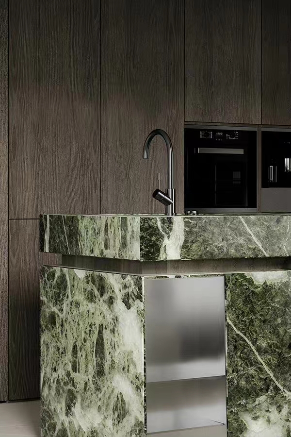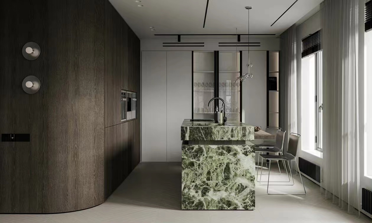 把大理石應(yīng)用在現(xiàn)代風(fēng)格廚房中,就有了高貴奢華的氣息,大理石中深色的紋路增加了廚房的抽象藝術(shù)感覺。