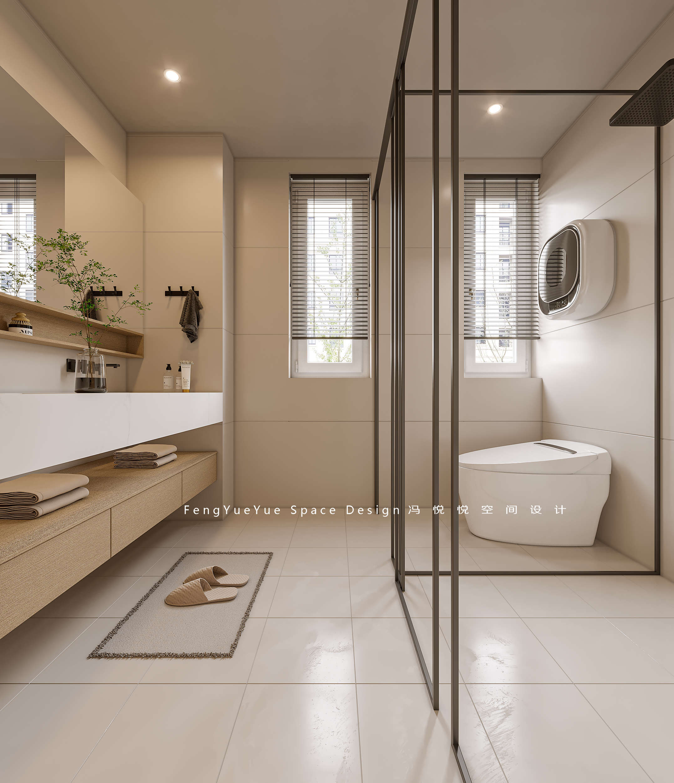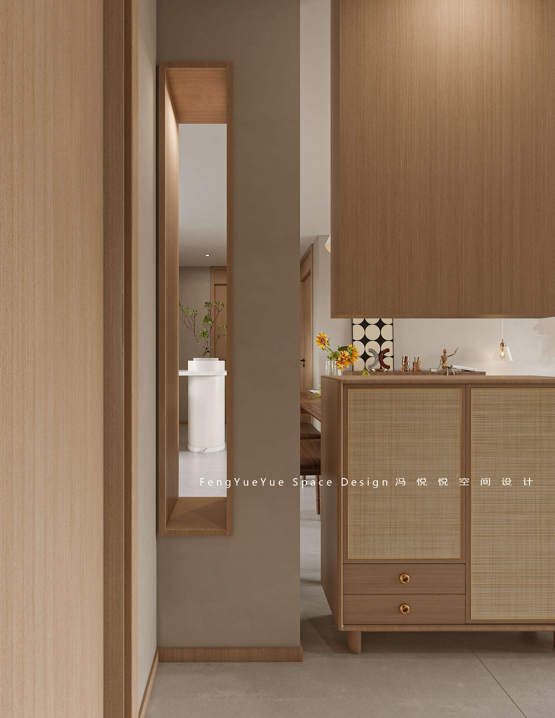 一開門便是身心放松的開始:定制的鞋柜、隱隱約約的玻璃隔斷搭配木質(zhì)懸挑的裝飾臺,再加上簡單的綠植搭配,簡潔不擁堵。