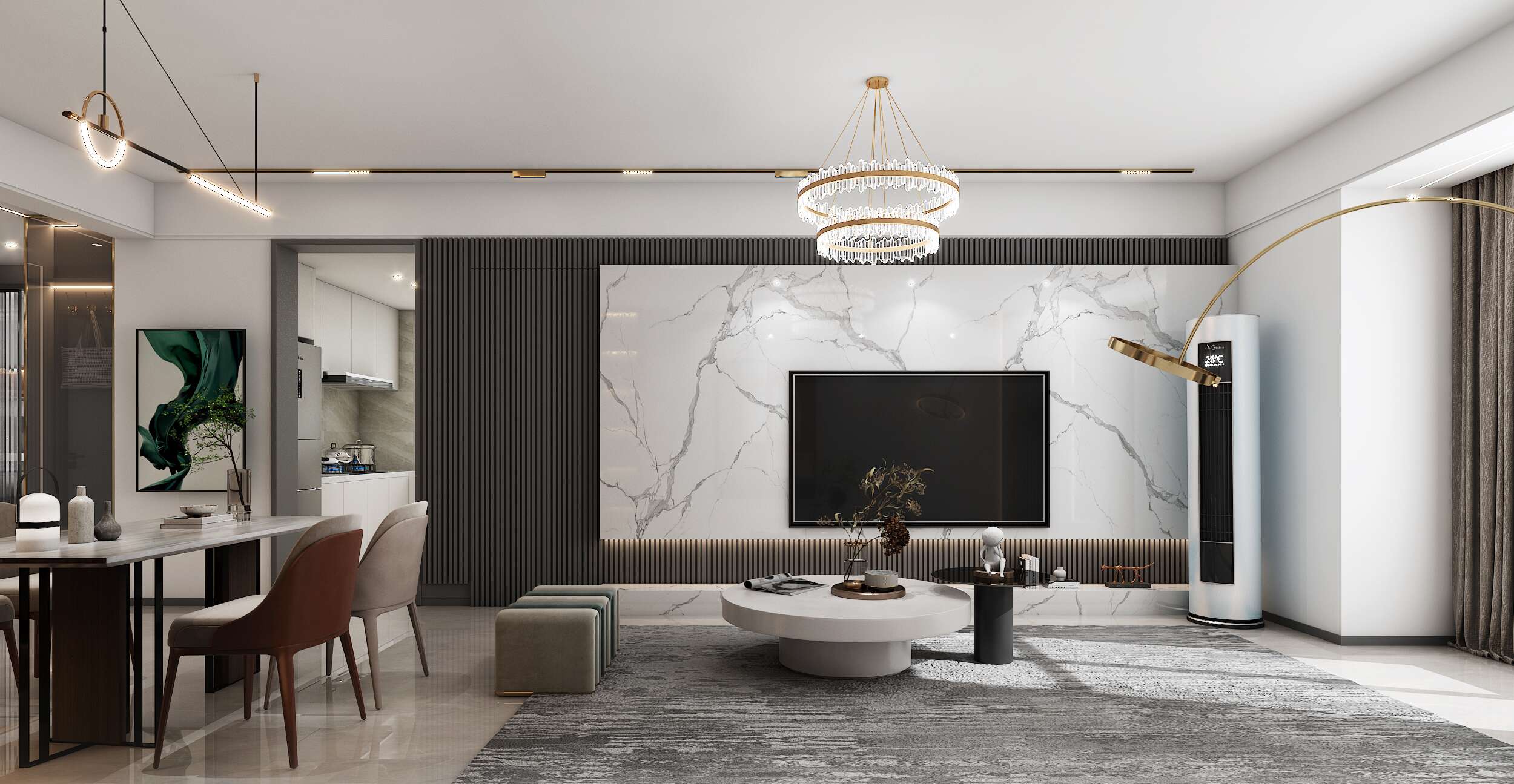 電視背景墻采用大理石上墻,整體感覺大氣沉穩(wěn)。獨(dú)特、奢華而又低調(diào)的藝術(shù)氣質(zhì),代替了現(xiàn)代風(fēng)格統(tǒng)一明確的特性,在藝術(shù)風(fēng)格上更加的多元素化。餐廳區(qū)域酒柜的加入,使整個空間更加高級。