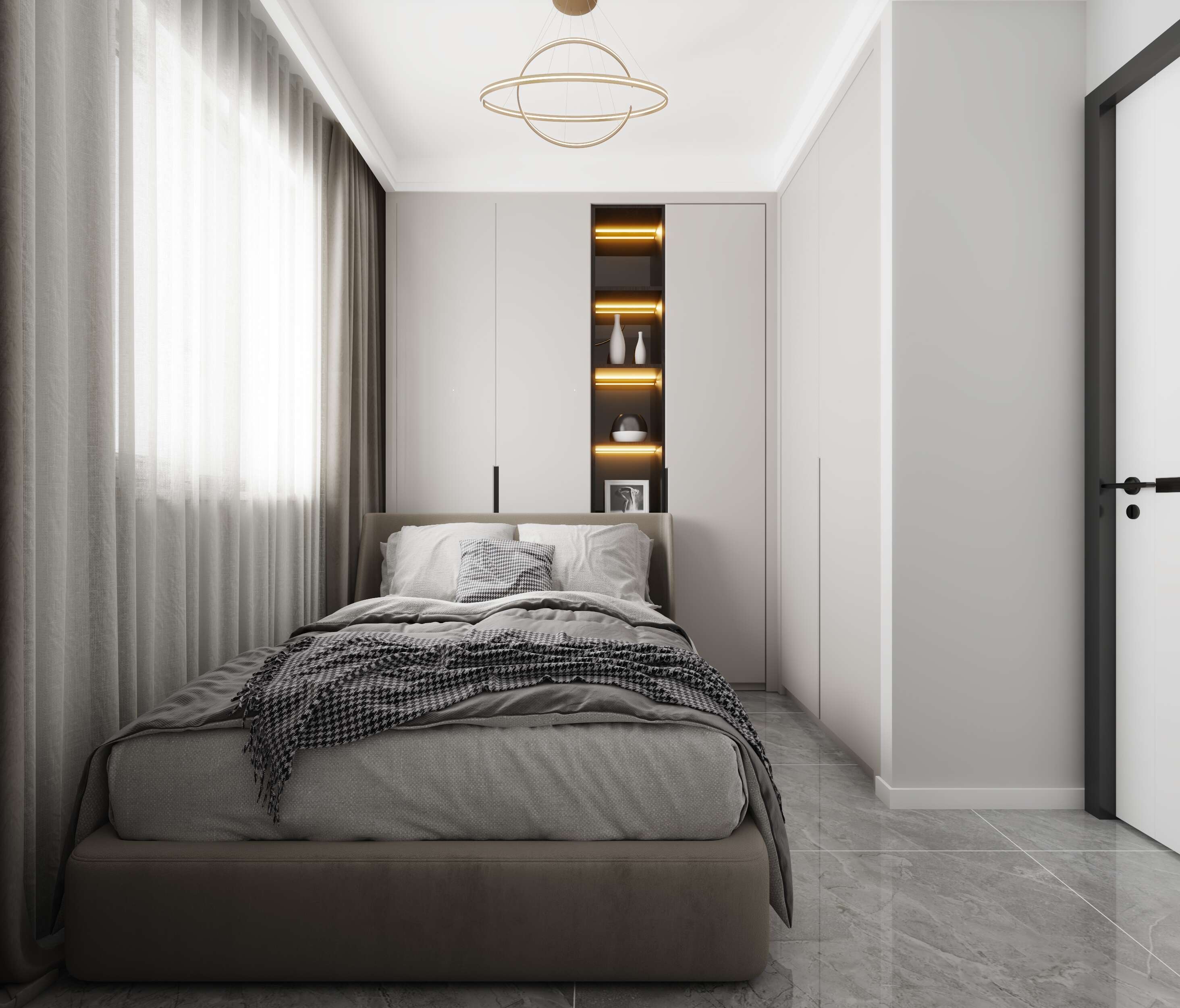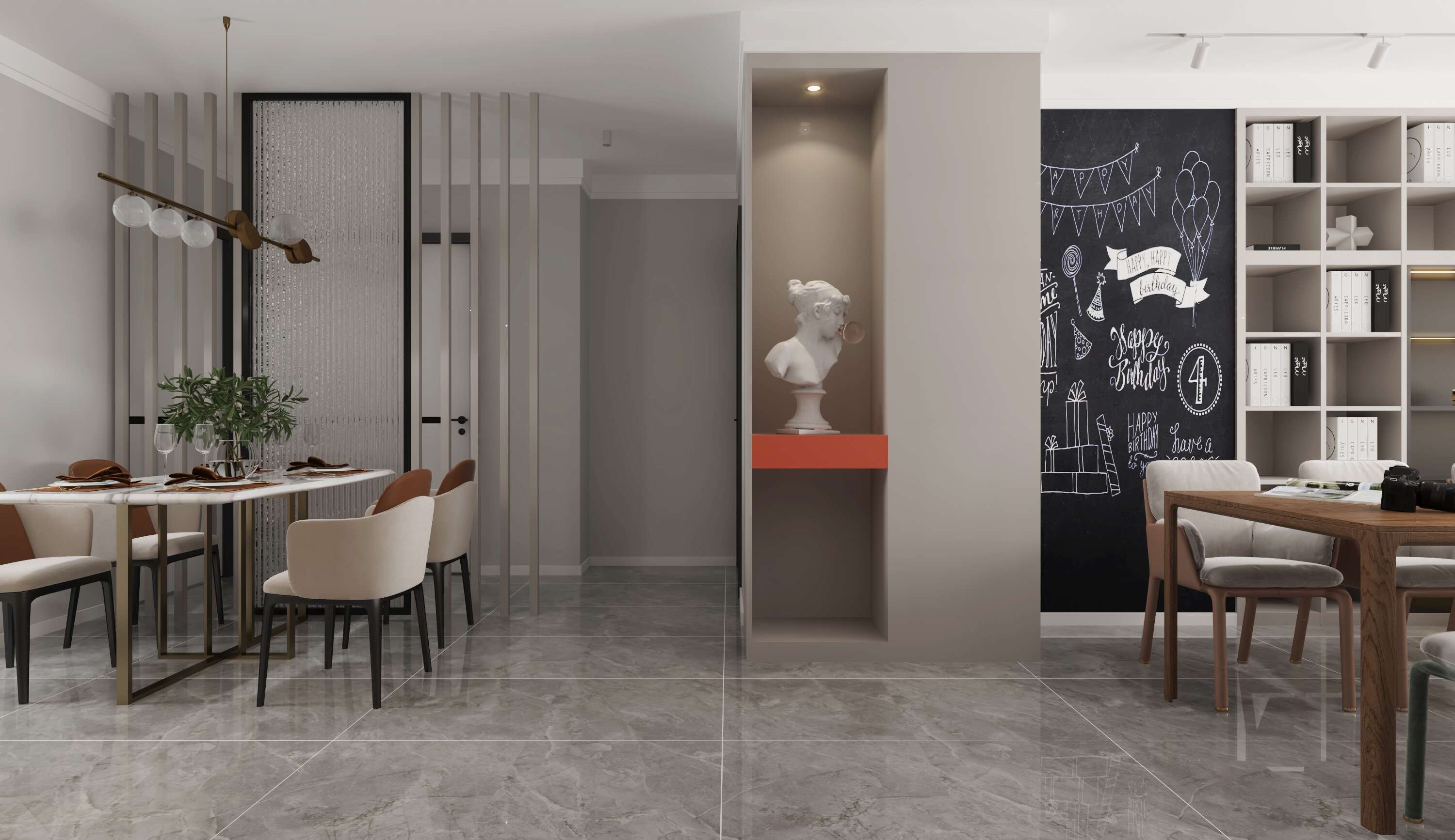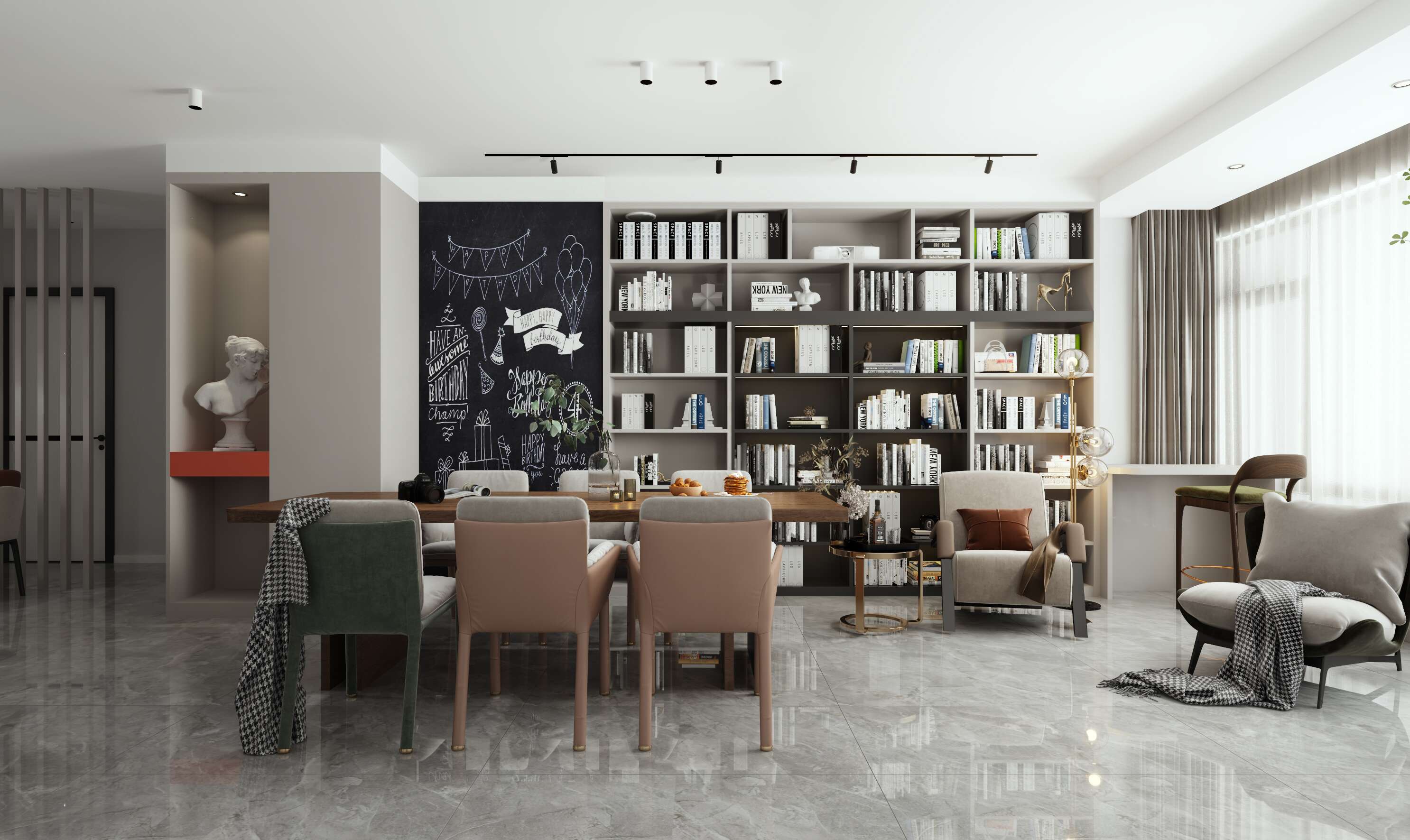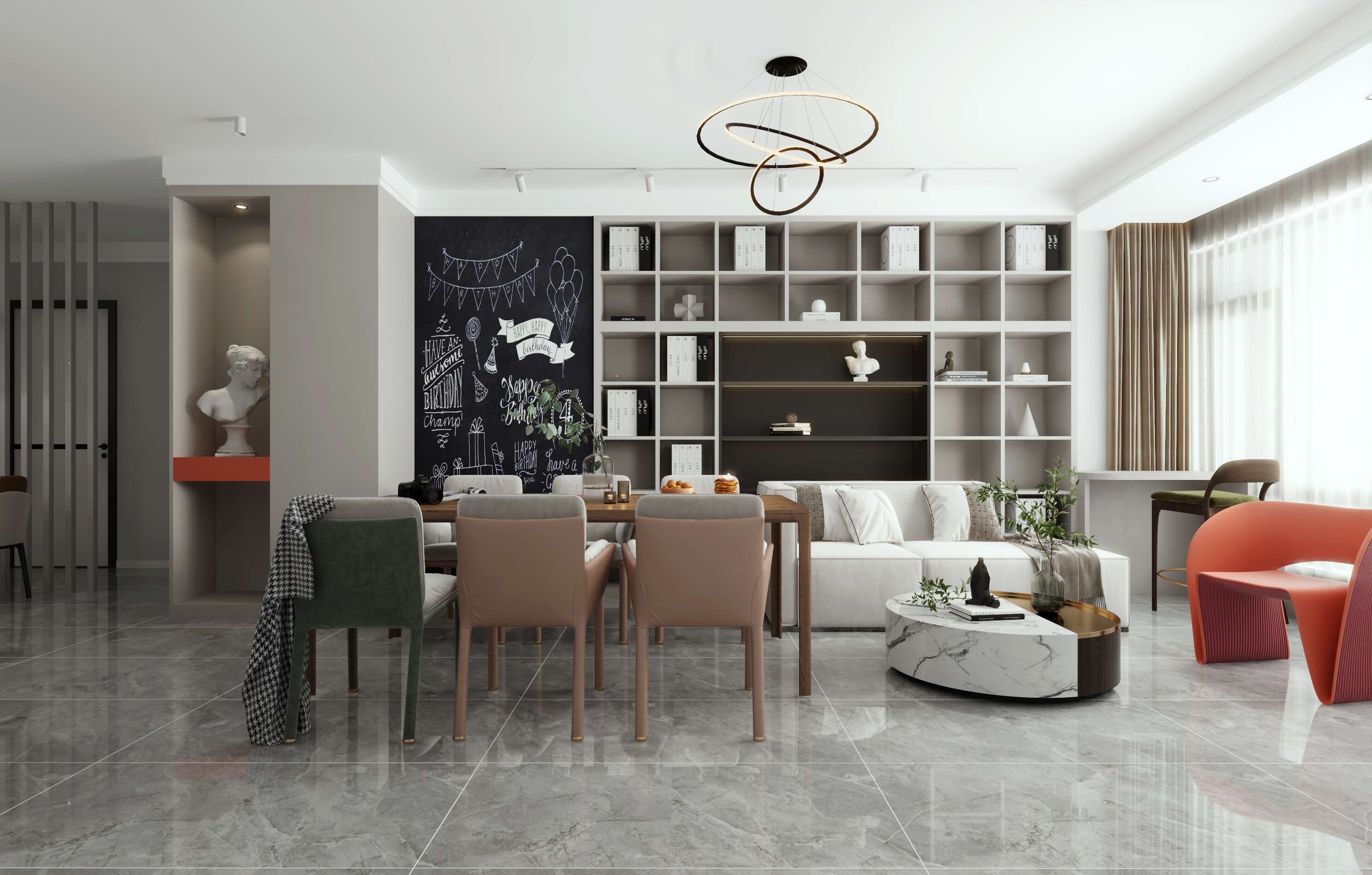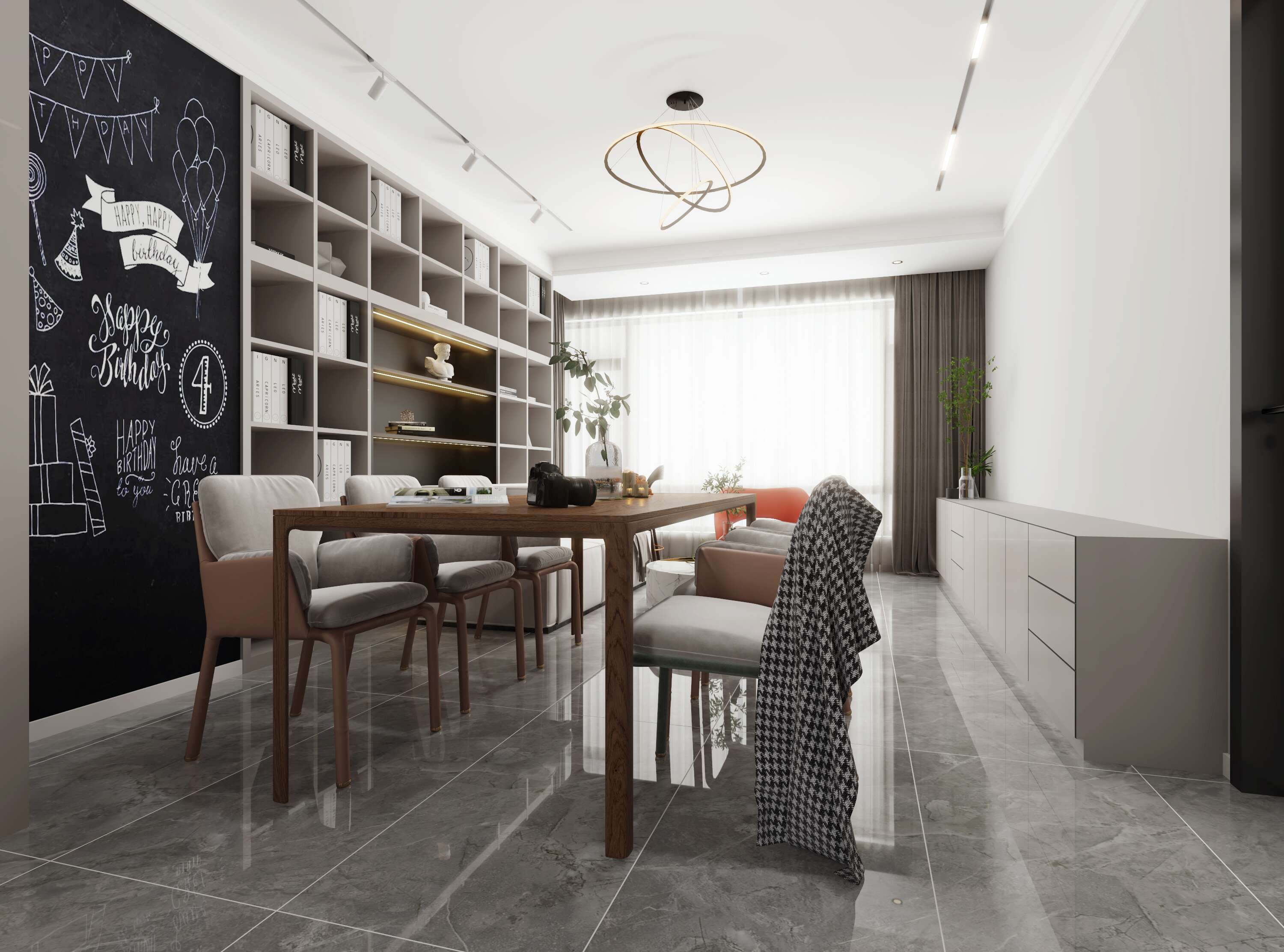 開闊的客餐廳是對當(dāng)代設(shè)計的一種全新解讀,餐廳客廳一體化,空間利用率做得非常的棒客廳的整面收納是這個區(qū)域設(shè)計的亮點,增加了很大的收納,可以滿足業(yè)主愛書的習(xí)慣,同時也作為了客廳的裝飾,在書架旁邊安排了黑板,對于小孩愛在墻上亂涂亂畫的習(xí)慣可真是很有號碼。