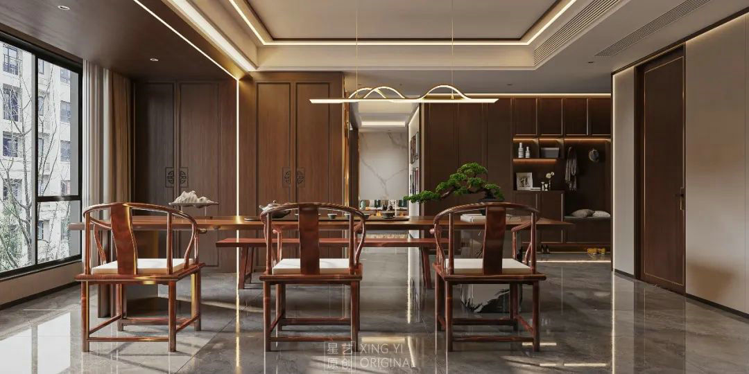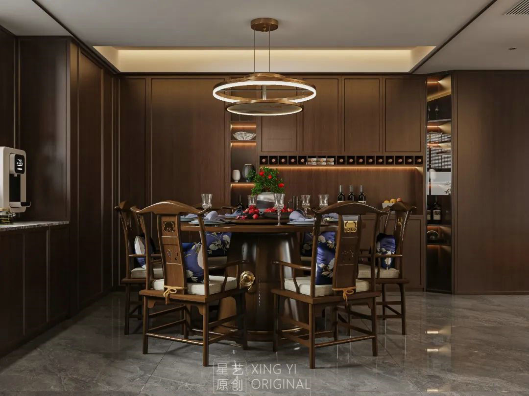 餐廳是一家人用餐聚餐的共享空間,作為用餐空間,這個空間通常以舒適輕松為主,在于講究禮儀的人來說,用餐也是個比較講究儀式感的空間。新中式風格在近幾年的裝修主流中,可以說是一個受到諸多年輕的成功人士裝修的首選,主要是新中式在延續(xù)了中式儀式感的同時,又結合了年輕人的審美追求,是一種非常有意境的設計風格。
