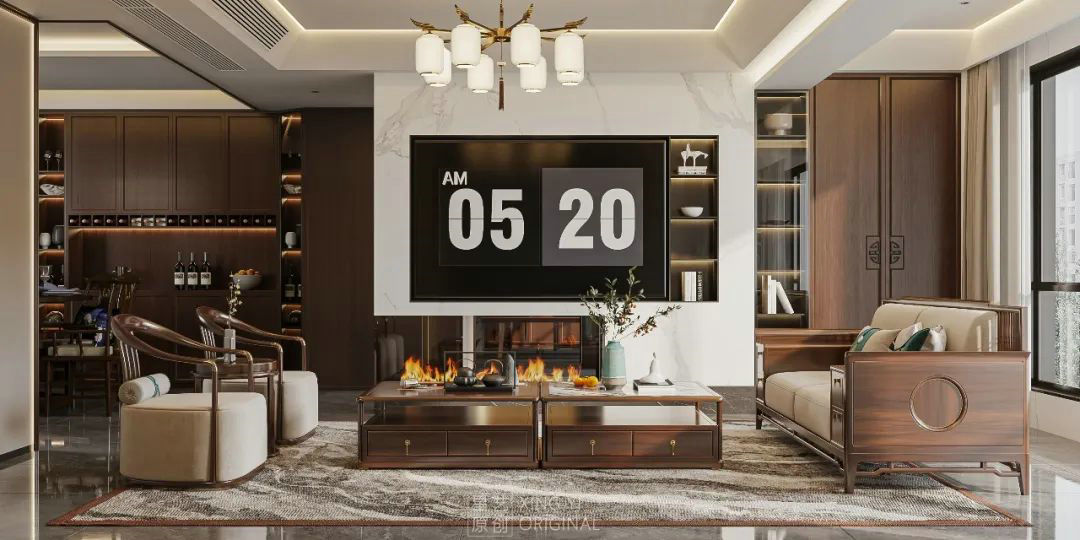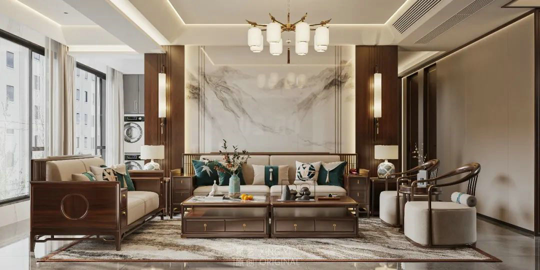 新中式客廳設計在色彩上深重而成熟,造型簡樸優(yōu)美,布局對稱雅致;在裝飾細節(jié)上崇尚自然情趣,富于變化,渾然之氣,端莊豐華,恢弘大氣,彌漫著一股獨特的東方韻味,散發(fā)出亦古亦今的層次之美。