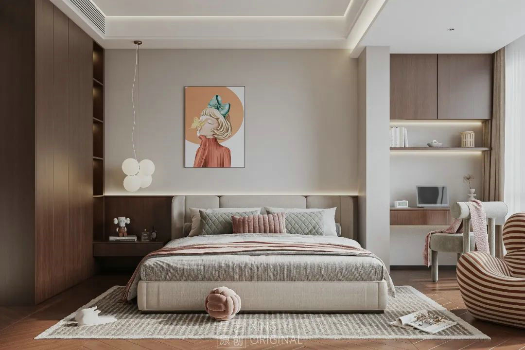 新中式符合現(xiàn)代兒童審美的卡通元素,使房間充滿童趣的回時兼具了傳統(tǒng)韻味。非洲紅胡桃木打造的床體更加堅固耐用,搭配小巧可愛的兒童床頭柜,小孩子的小物件跟小秘密可以收藏其中。搭配新中式書桌椅跟兒童書柜,學習方面的事情自己搞定,收納得整整齊齊,家長不用再操心,自己的事情自己做。淺色調為主點綴少量藍色的設計背景墻,使房間兼具舒適與跳脫,非常實用。
