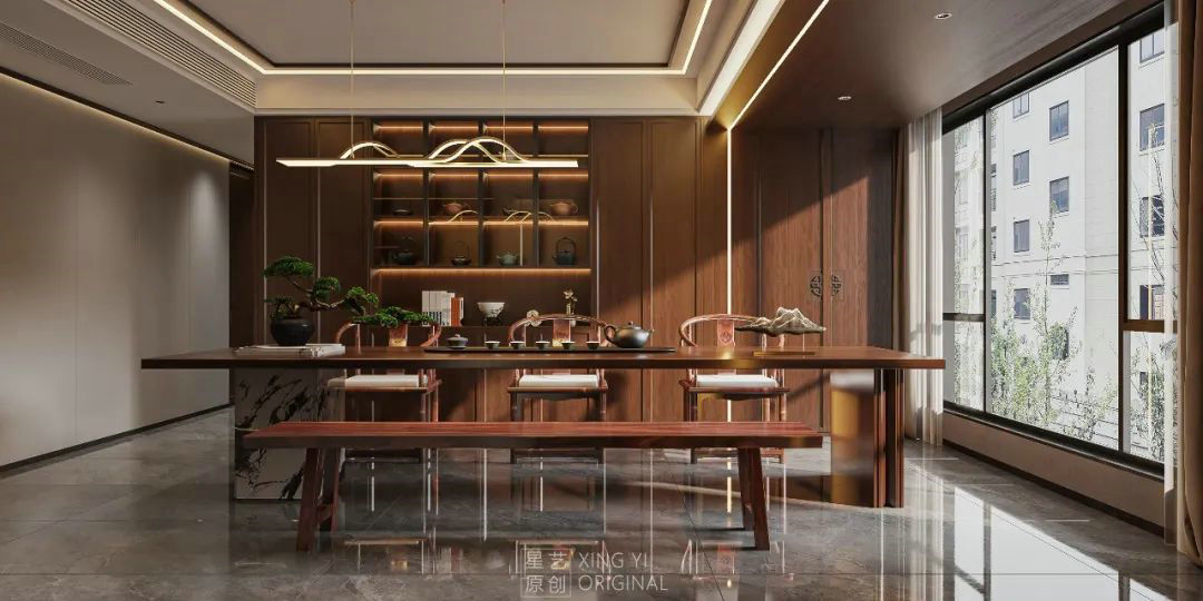 新中式的茶室自然少不了茶桌,新中式茶室并不需要復雜的裝飾,一方架子,一處茶幾,幾張椅子,素凈無華、靜穆清雅,線條于空間完美結合,讓素雅的茶室有了生機,能夠在這里面喝茶,所有的煩心事都會煙消云散的。