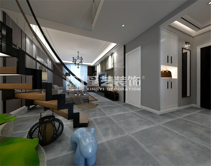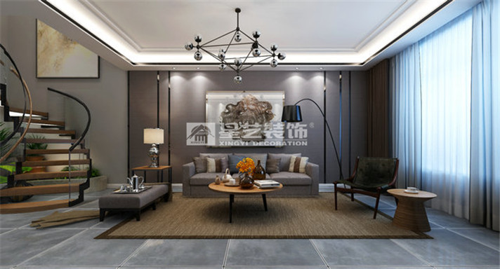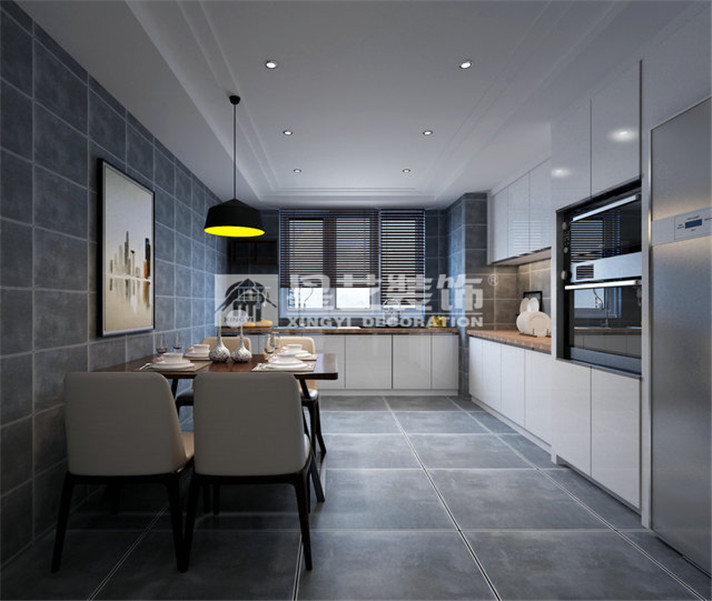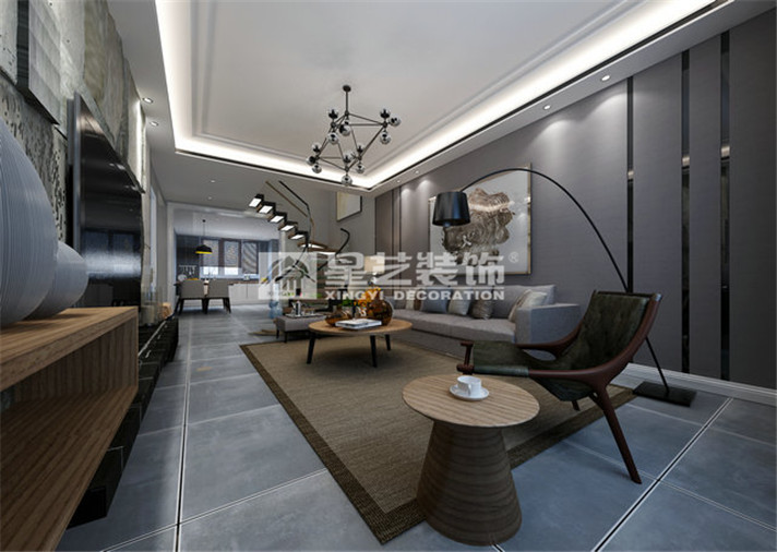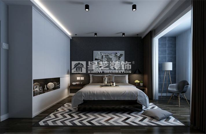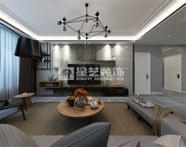 本案業(yè)主是一對年輕時尚的夫婦,喜歡簡潔的黑白灰空間。地面運用不規(guī)則大小的水泥磚滿鋪,電視背景使用爵士白大理石做造型,明暗的對比使空間看起來更開敞明亮。廚房開放式吧臺和餐桌延續(xù)設(shè)計,視覺上增加了客廳的面積,也使整個空間采光更加明朗敞亮。