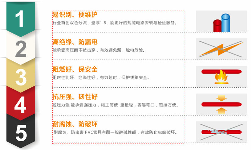 行業(yè)首創(chuàng)雙色電工套管 ,根據(jù)星藝裝飾標(biāo)準(zhǔn)工藝的要求:為了更好的規(guī)范電路工程,確保工程品質(zhì),及監(jiān)理與業(yè)主對(duì)電工項(xiàng)目的檢查與驗(yàn)收,采用優(yōu)質(zhì)的阻燃型有色PVC 塑料管作強(qiáng)、弱電線保護(hù)管材。紅色——強(qiáng)電及照明用電專用,藍(lán)色——弱電項(xiàng)目專用。