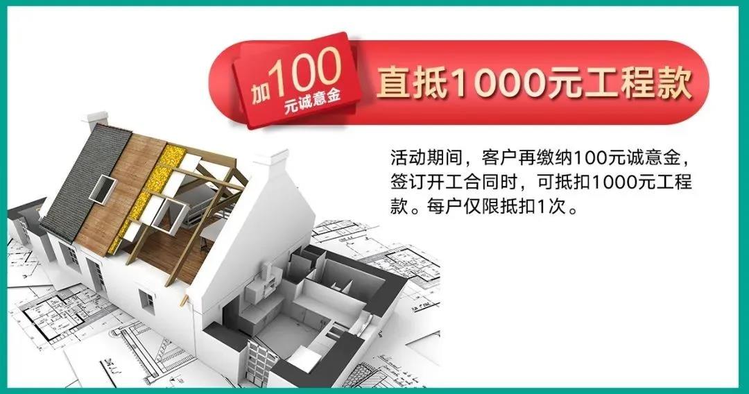 活動(dòng)期間,客戶再繳納100元誠意金,簽定開工合同時(shí),可抵扣1000元工程款。